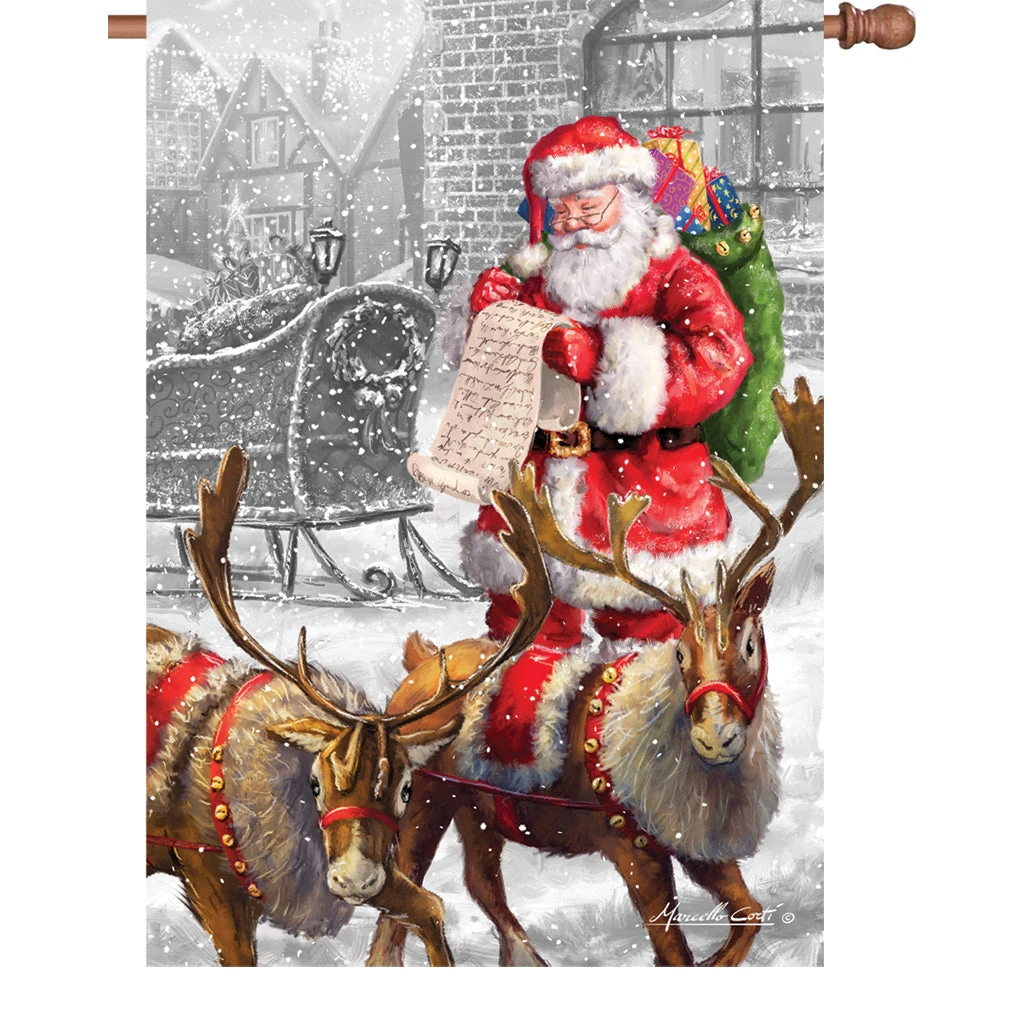 Illuminated Flags are made from durable fade resistant polyester fabric. They are sublimated with bright colors and eye-catching themes. This flag features Santa reading his gift list while two reindeer lead him on a snowy day.